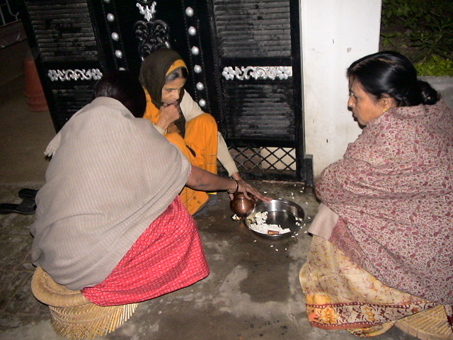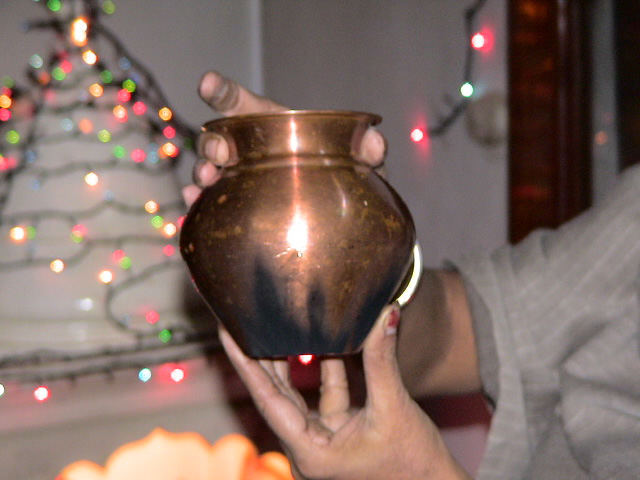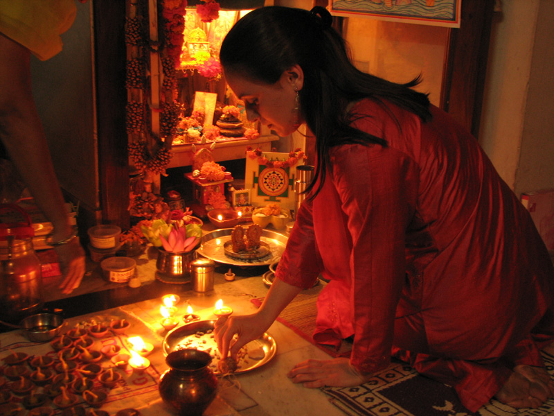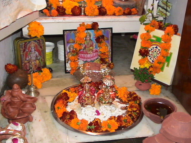 Deepavali - the festival of rows (avali) of light (deep) - is the joyous celebration of Lord Ram's victorious return to Ayodhya. During his exile of 14 years Lord Ram defeated the powerful demon king Ravana. Dhanwantari Treeyodashi Deepavali - or Deevali - the festival of lights is actually a four days series of festivals starting with Dhan Teras or Dhanvantari Treeyodashi. Two days prior to Deepavali, on the 13th day of the descending mooncycle in the sin-destroying month of Kartik (October/November), Hindus worship Lord Dhanvantari, the Cosmic Physician with the healing touch, who appeared with the vessel of amrit (nectar of eternal life) during the famous "samudra manthan", the "churning of the ocean". Lord Dhanvantari is often called "the father of Ayurveda" - the science (veda) of long life (ayu) as the traditional Indian medicine system is called. On the Dhanteras day, Lord Dhanvantaris birthday is celebrated, everyone purchases a new household utensil made from silver, copper, brass, or any other metal. The vessel is filled with puffed rice and kept at the shrine where Lakshmi will be worshipped in the darkest night. It is believed that during the Diwali puja Dhanvantari deposits health and Lord Kubera (the God of wealth) deposits riches in it. The word dhan means also wealth and Lakshmi, the goddess of prosperity, includes good health. And honestly, what would be wealth without good health? Narak Chaturdashi The following day is the 14 th day in the descending moon cycle of Kartik. On this day Narak Chaturdashi is celebrated, "Narak" literally means hell, and Narakasura was once upon a time a terrible demon (naraka) on earth, who was defeated by Lord Krishna and his noble wife Rukmini. Rubbing the body with oil and taking bath before dawn is believed to be of specially great value on Narak Chaturdashi and the day after. Oil acts as a great purifier and rejuvenator. Ancient scriptures mention that during the hours of dawn before Chaturdasi, the new moon day, when the sun is in the zodiac sign Libra, water anywhere in the world is getting the quality of the holy Ganga water and has the power to purify all and everything, and all oil becomes saturated with the auspicious presence of Sri Mahalakshmi. In North India ladies perform a puja in the evening while they squat at the open main entrance of the house near a "nala" (open canalisation) and recite a traditional story in the light of a mustard oil lamp. A copper or silver lota (vessel) is held or placed near the mustard oil flame and the carbon that deposits on the vessel is later applied to the eyes of all family members as "kajal" (protection for the eyesight). It is believed that by doing so one will not feel afraid if one happens to meet the Lord of Death, Lord Yama, in the coming new year. The story of Naraka-Chaturdasi "Once upon a time an extreme lazy and depressed Brahmin lady and her daughter met Yama Raj, the Lord of Death. Both of them consulted him because they felt extremely bored and depressed due to their own laziness. They asked Yama how to get rid of their boredom. Yama Raj felt compassion for them and said, "You may come with me and help me taking care of my children!" The ladies agreed and started working for the Lord of Death. But soon they felt bored and lazy again. Again they complained to Yama Raj, who said, "Well, what to do? I cannot help you. If you feel so much fed up with any kind of job, it's better you change your form, become a worm and spent your days in the drains where you can sit comfortably and feed on what others have already digested. After hearing this the ladies became what Dharma Raj (another name for the Lord of Death) had suggested. After a long time of remaining in the incarnation of a worm in the drains they again got fed up with the lowest of lower existence. And they prayed to the Lord of Death again. Again the Lord of Death showed compassion. He said that even in the form of the lowest creatures of existence they could get liberated if they happen to crawl near a nala (open canalisation) where ladies perform this ritual, and if a drop of the water used during this ritual is dropping upon them they will be purified and liberated." As soon as some lower creatures, like worms, bucks, or insects are passing by while the story is narrated the ladies compassionately sprinkle a few drops of their puja water (which contains Ganga water) on those lower forms of existence for their liberation. Deepavali (Diwali) The main Deepavali - the festival full of lights - is celebrated during "Kartik Amavasya", the darkest night in the descending mooncycle of the lunar month called Kartik. Already at dawn people massage their body with oil followed by a Ganga bath (or a symbolic bath with some drops of water of the holy river Ganga) for purifaction. Hindu scriptures state that all water that is also used by the light of the stars becomes Gangajal. That explains why many saints and spiritual aspirants take bath very early in the morning preferable even before sunrise. Shopkeepers and businessmen open their new account books on this day while chanting repeatedly the name of Sri Lakshmi, the goddess of prosperity, who plays a central role in this festival. Traditionally artists depict the lotus-goddess Lakshmi in two different images. Whenever she appears with her divine husband, Lord Vishnu, she is shown with just two arms. On Deepavali, when she is seen in company of Lord Ganesha, the obstacle remover and Lord of all auspicious beginnings, she has four arms. In one or two of her hands she holds a lotus, with the third hand she grants fearlessness and blessings to her devotees, and in her forth hand she holds a golden pitcher from which she showers gold coins distributing prosperity and thus reminding us that all kind of riches comes from a divine source. Lakshmi is that divine principle that supports the earth and her devotees with inexhaustible material and spiritual wealth and comfort. Her true devotees
