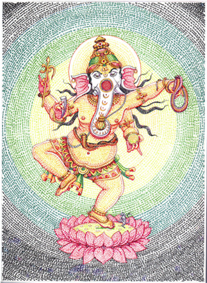 Ganapati, the God of Wisdom, with his big cosmic belly and a beautiful elephant face brings happiness to all existing beings. "He is the one who is immortal, all-merciful, and all-forgiving, and he bestows on his devotees a well-disposed mind", states an ancient scripture known as Ganesha Pancharatnam. The son of Mother Parvati and Lord Shiva is the most popular God in India. Practically everyone who believes in Him - not only as a symbol to explain Hindu philosophy, but as "real being" - invokes him first, knowing that HIS blessings grant smooth sailing. Ganesha is that all-pervading "spark" of Cosmic Consciousness that connects us with our "inherent wisdom" and allows us to start and complete a sacred rite or an auspicious work, and to find solutions to the problems we all face from time to time.